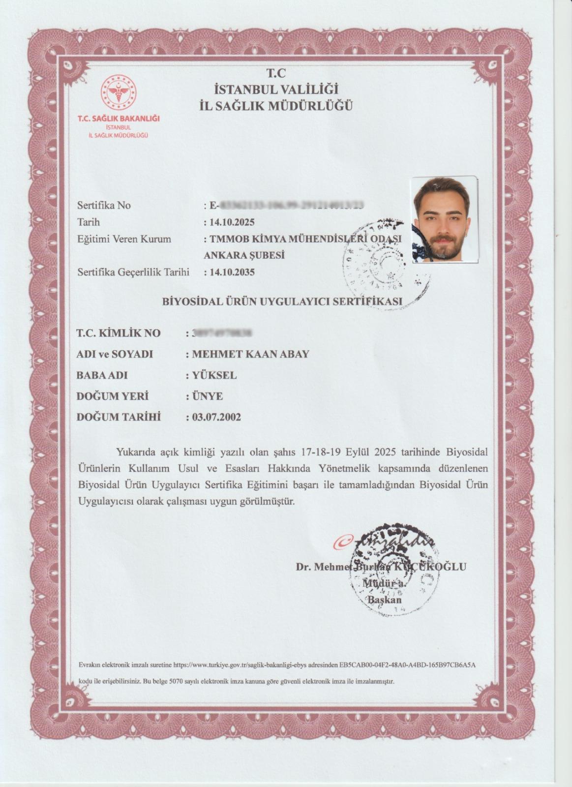 BİYOSİDAL UZMANLIK BELGESİ SERTİFİKASI