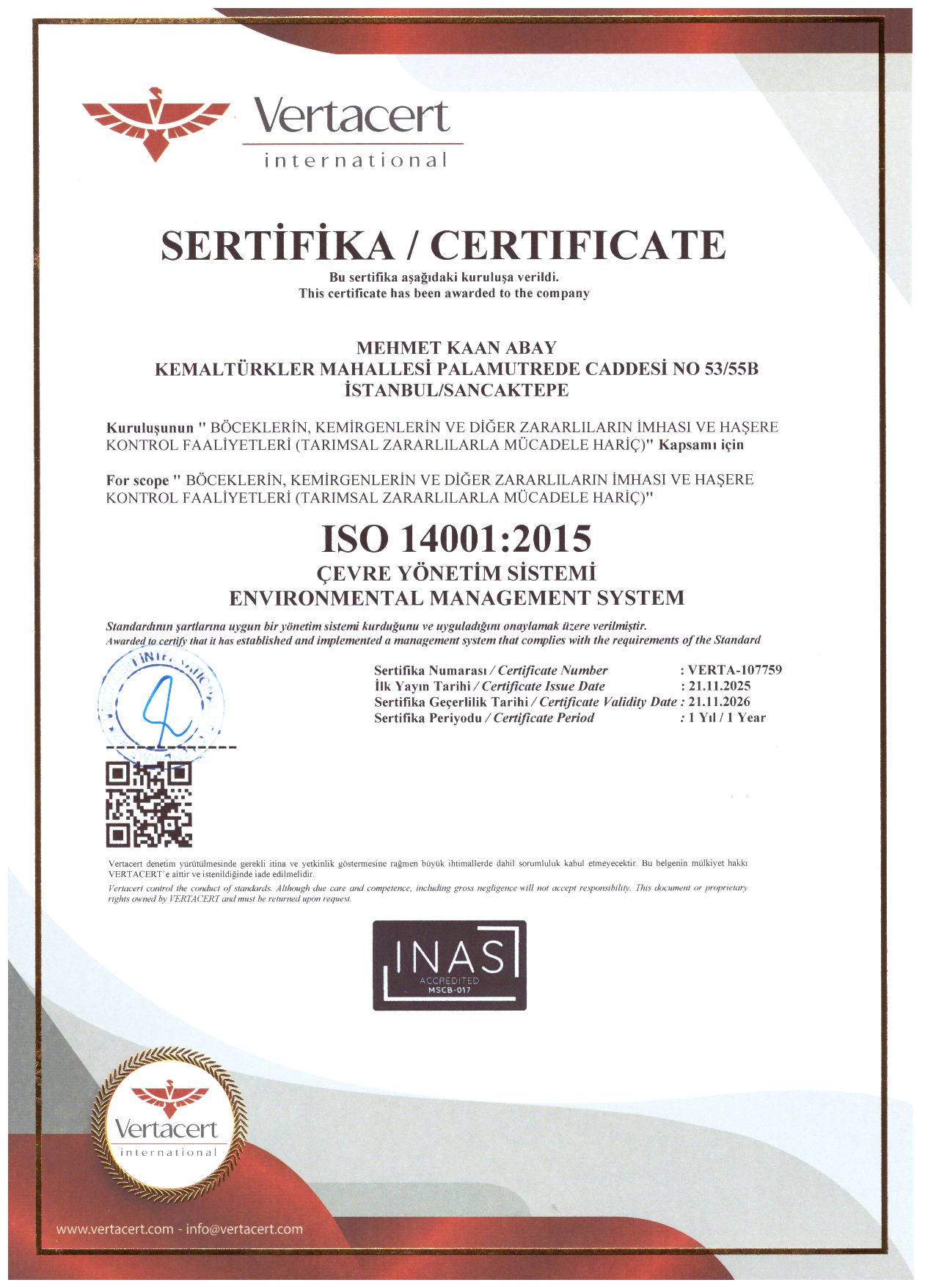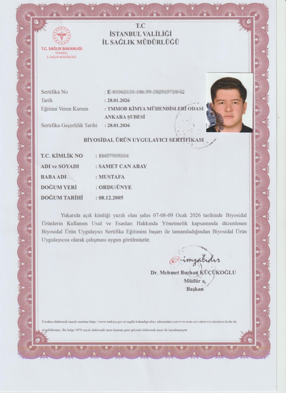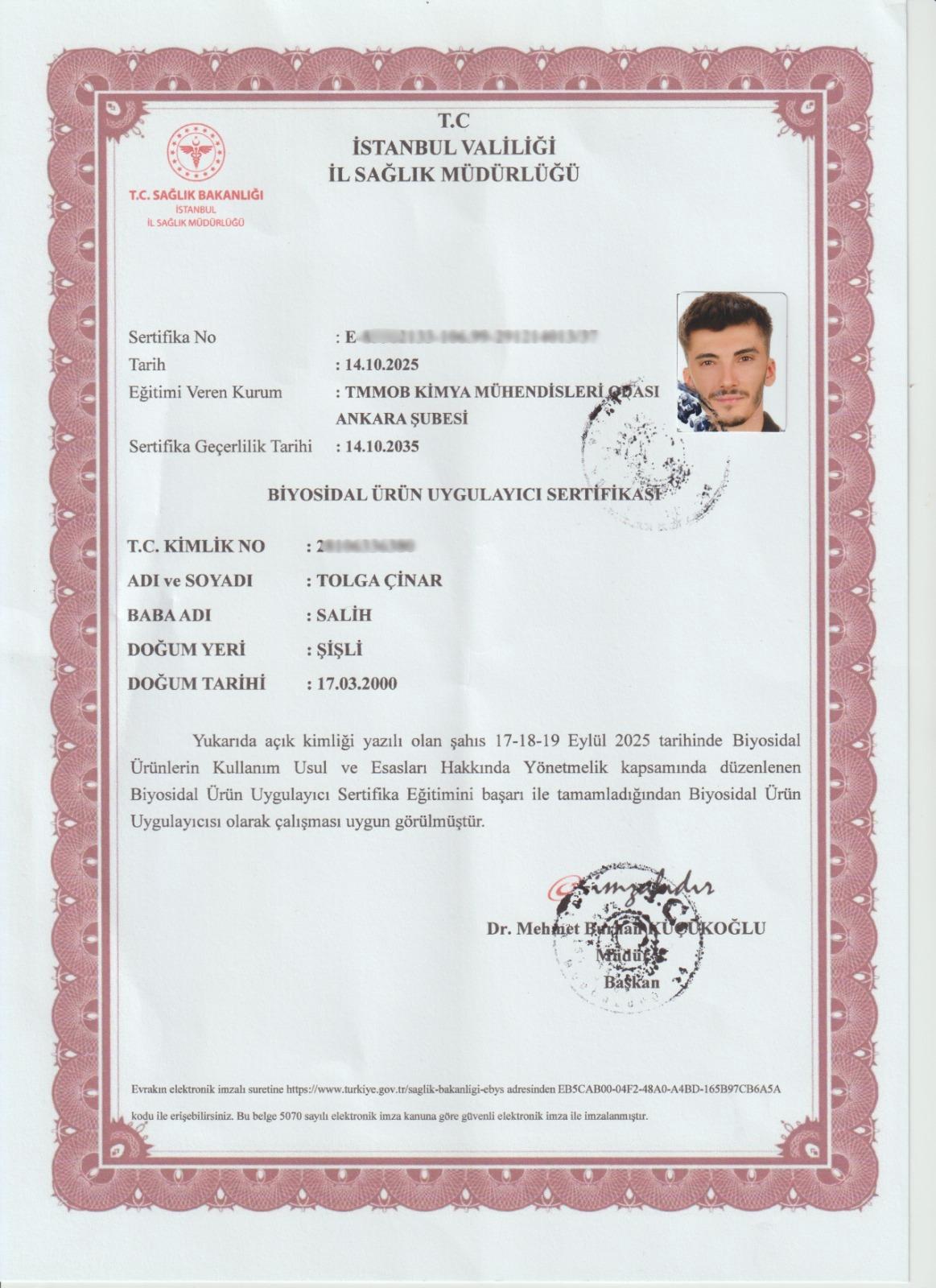 BİYOSİDAL UZMANLIK BELGESİ SERTİFİKASI