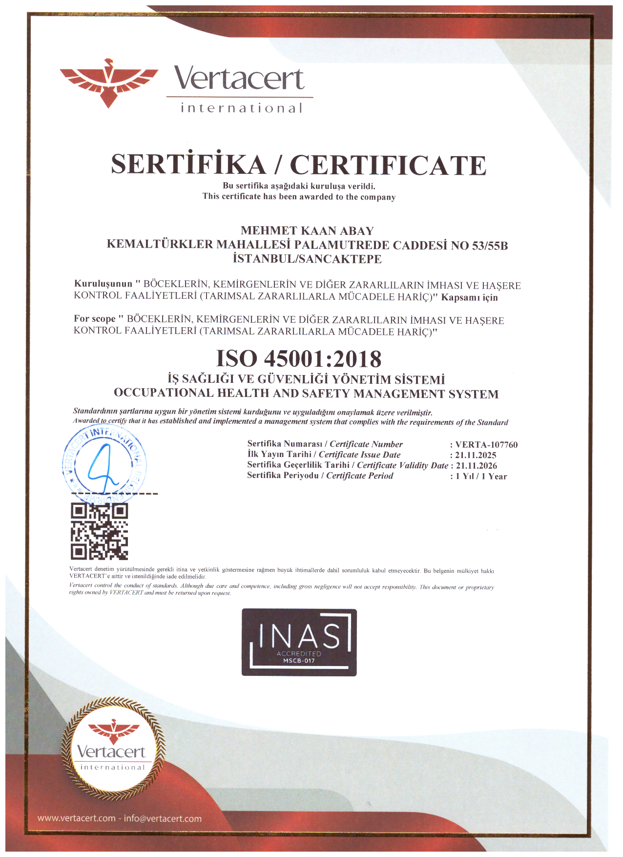 İSO 45001 : 2018 İŞ SAĞLIĞI VE GÜVENLİĞİ YÖNETİM SİSTEMİ SERTİFİKASI
