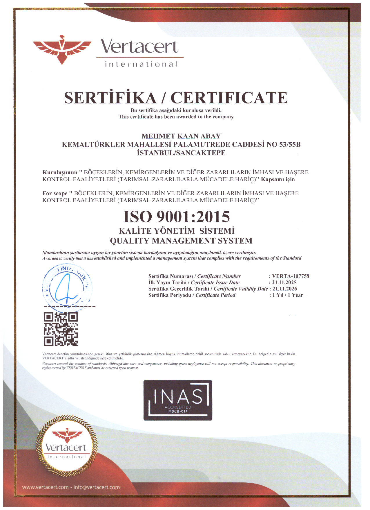 İSO 9001 : 2015 KALİTE YÖNETİM SİSTEMİ SERTİFİKASI
